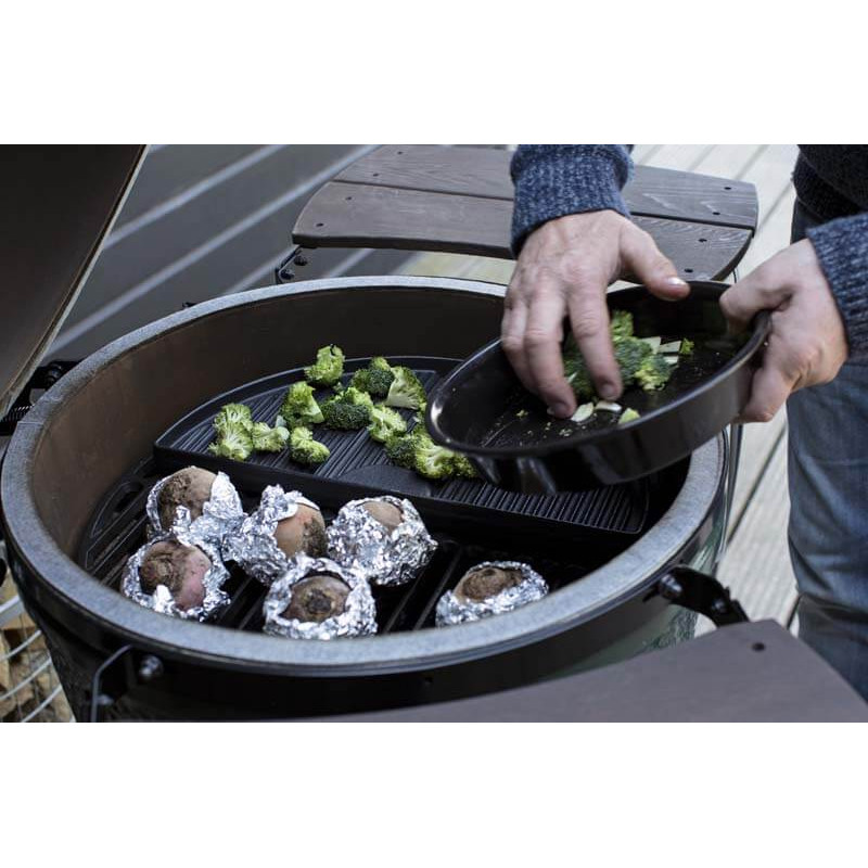 Полукруглая чугунная имеет две поверхности Гладкая поверхность идеально подходит для приготовления блинчиков и яичницы а на рифленой поверхности отлично получаются тосты или нежное рыбное филе Полукруглая планча занимает только половину пространства Big Green Egg а значит у вас есть место для одновременного приготовления других блюдОсновные характеристики